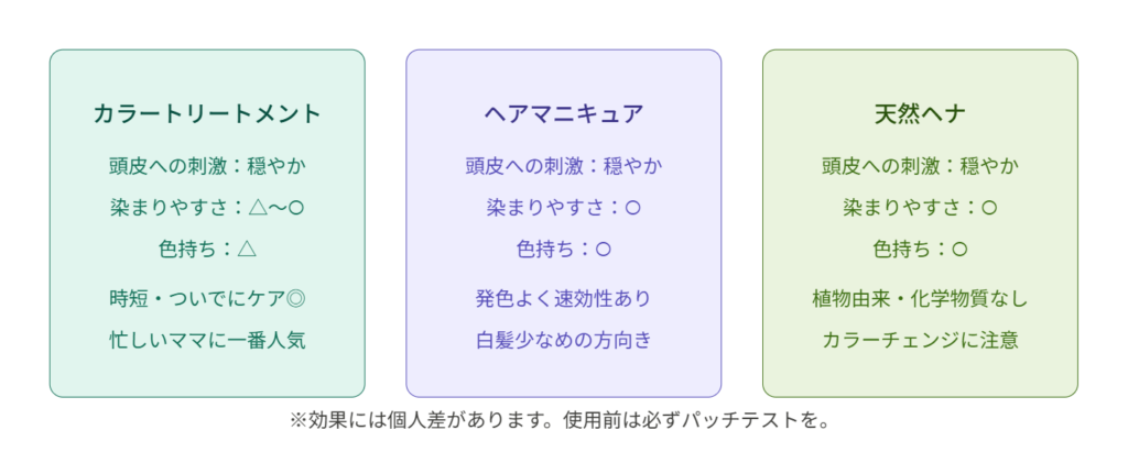- ジアミン・過酸化水素を含まない製品を選ぶ(カラートリートメントが時短&低刺激でおすすめ)